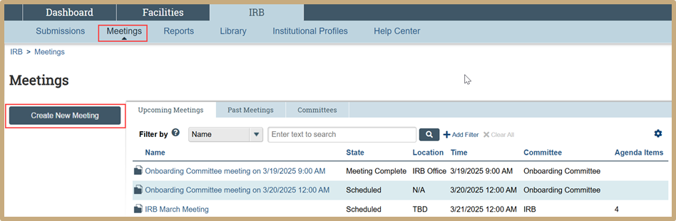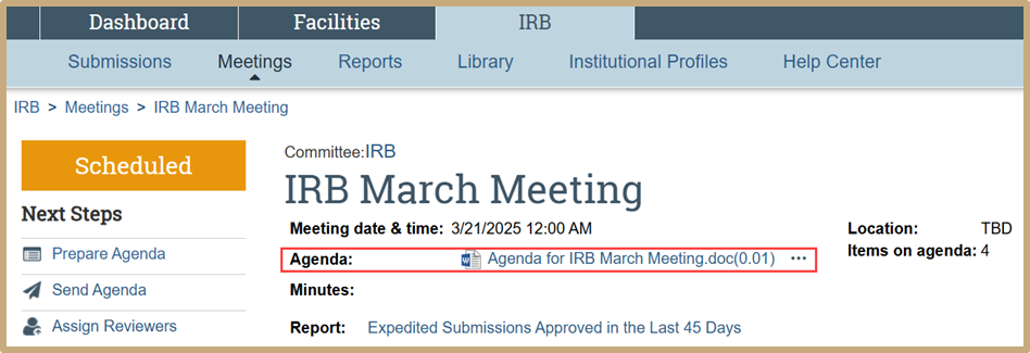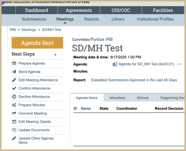 NOTE: Before generating agenda, all adverse events, noncompliance reports, inspection reports, and PAM reports must be uploaded under “supporting documents”. Once these documents have been added, an agenda can be generated.
