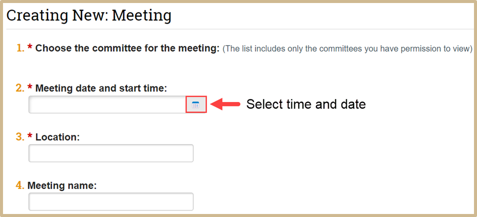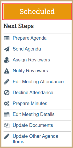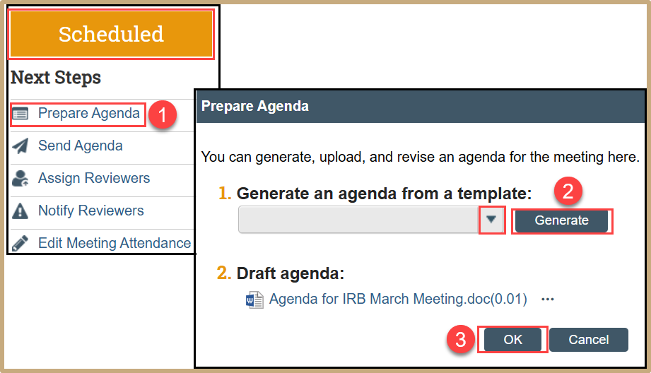 Click Prepare Agenda. You can then generate, upload, and revise an agenda for the meeting by selecting Agenda Template from the dropdown menu. Then click on Generate.