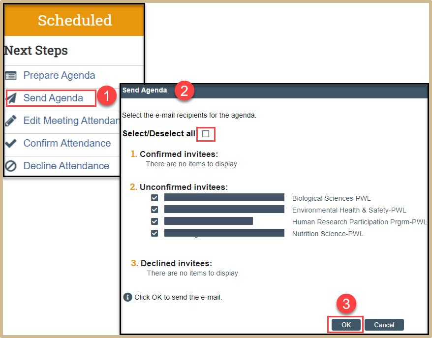 Click Send Agenda. Select the e-mail recipients for the agenda that you would like to send to. Once finished, click OK.