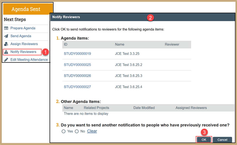 Select Notify Reviewers. Review agenda items information. Click OK to send notifications to reviewers.
