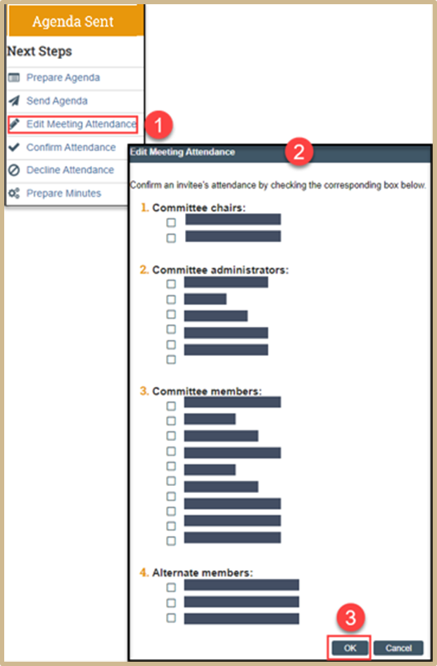 Click Edit Meeting Attendance. Confirm invitee’s attendance by checking the corresponding boxes. Once finished, click OK.