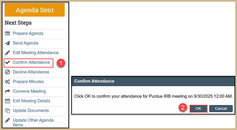 Click on Confirm Attendance. Click OK to confirm your attendance for the meeting listed.