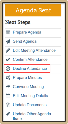 Click on Decline Attendance. Click OK to decline your attendance for the meeting listed.