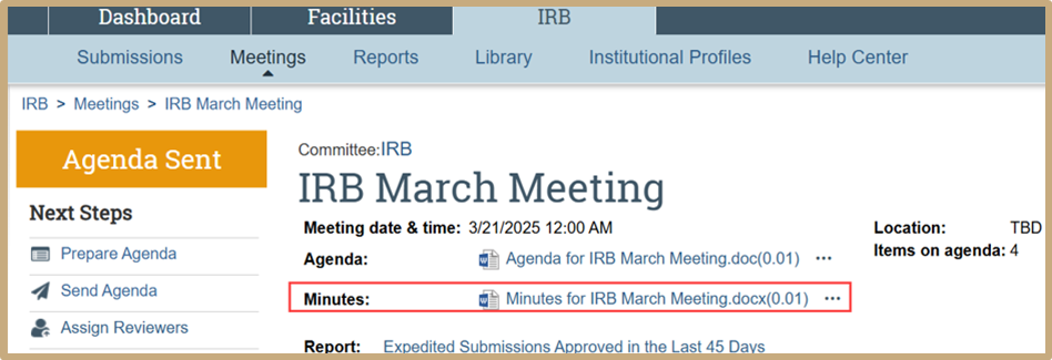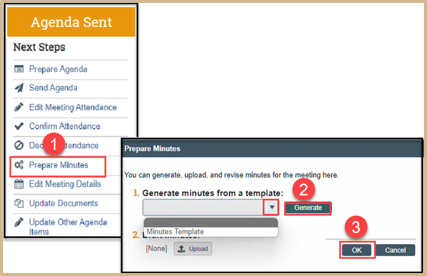 Click Prepare Minutes. You can then generate, upload, and revise minutes for the meeting by selecting Minutes Template from the dropdown menu. Then click on Generate.
