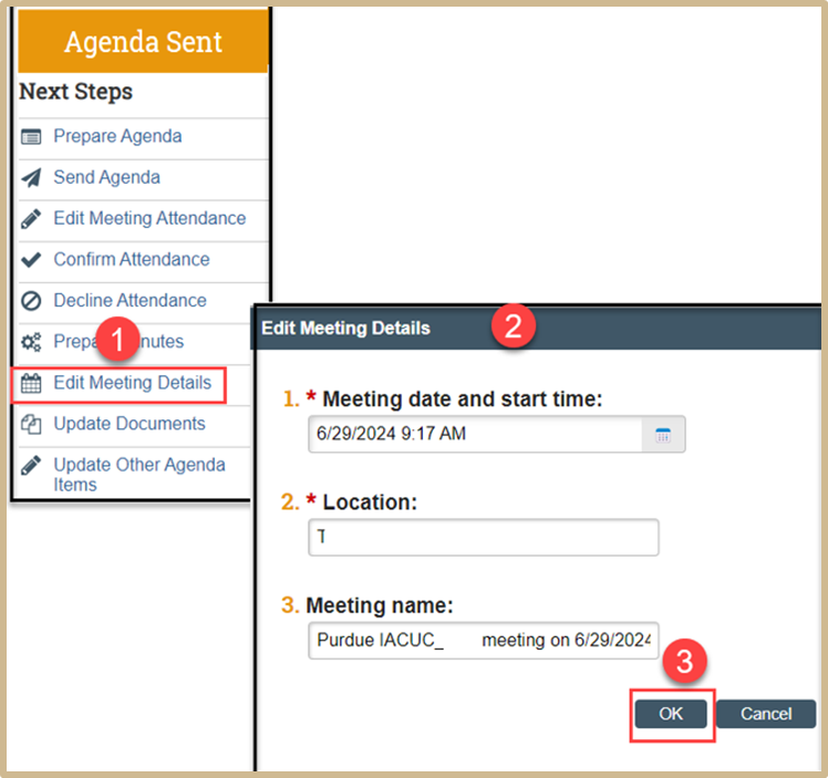 Click Edit Meeting Details. Make any edits needed to the meeting. Once finished, click OK.