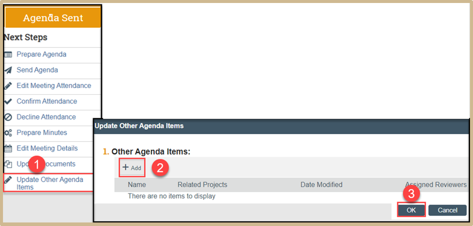 Click on Update Other Agenda Items. Add any other agenda items needed. Once finished, click OK.