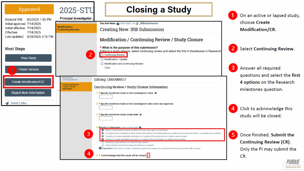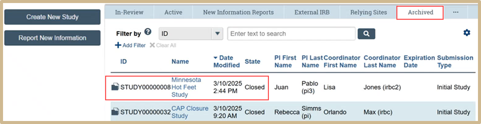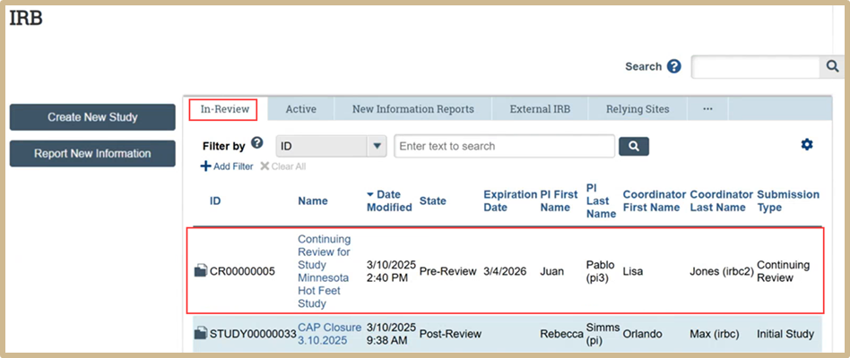 From the IRB tab, select In-Review. Find the study you want to close and select by clicking the study title. Closures will come in as a “CR” number, this number will be different than the Study number.
