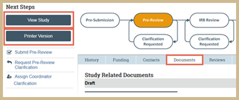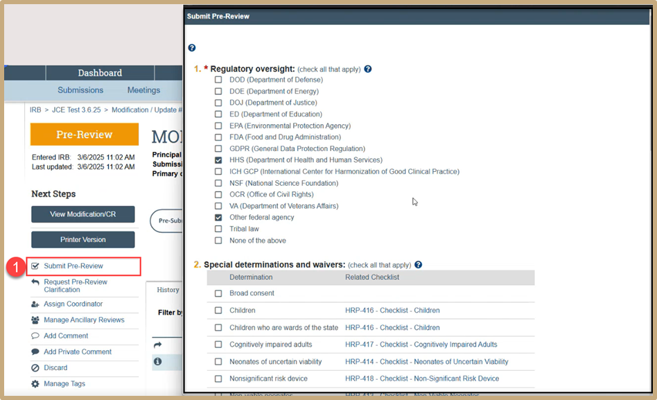 Select Submit Pre-Review. These questions will auto populate based on the original pre-review. You can go through and make any updates as needed, or you can just submit the pre-review if there are no changes.