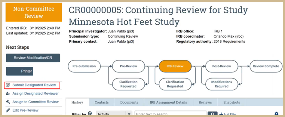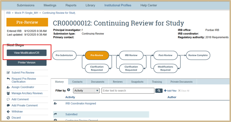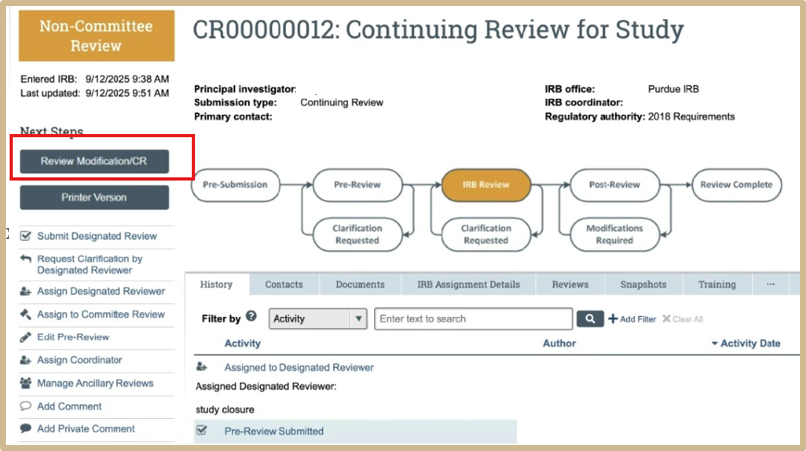 The designated reviewer needs to review first. Select Review Modification/CR. Review all information before submission.