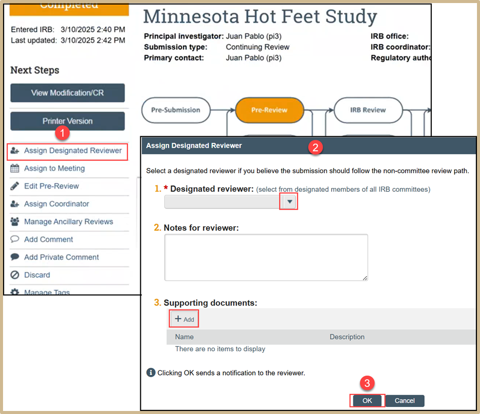 Select Assign Designated Reviewer. Select a designated reviewer if you believe the submission should follow the non-committee review path. Add any supporting documentation as needed. Click OK to send a notification to the reviewer.