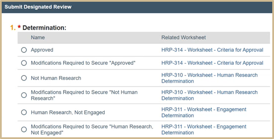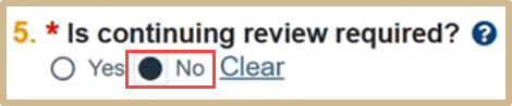 - Yes: Moves the submission to the Post-Review state so the investigator can be informed of the determination.