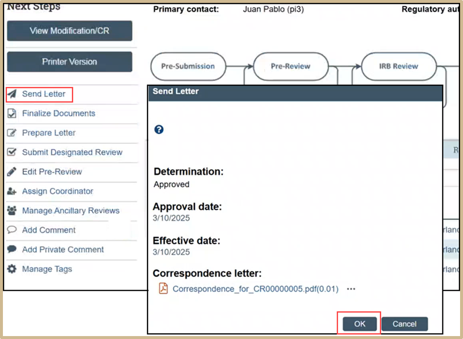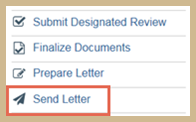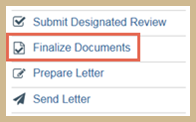 After the designated member or committee review decision has been submitted for a submission, the next steps are to finalize the documents and prepare and send the determination letter to PI.