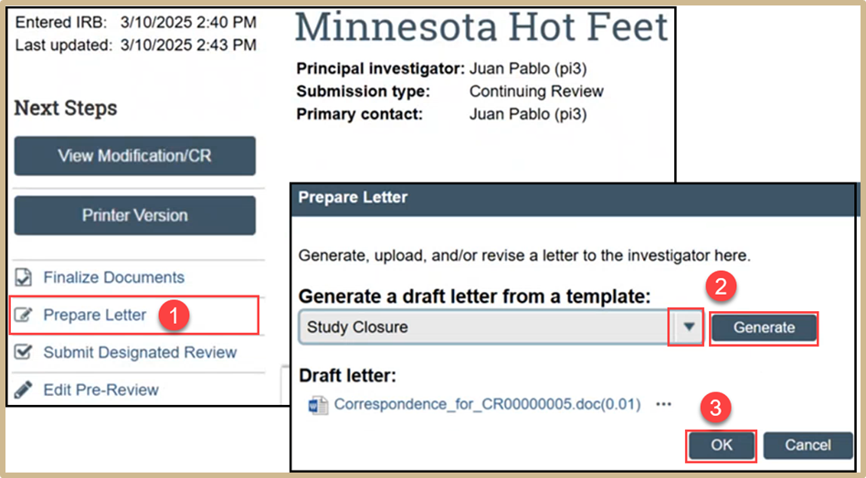 Select Prepare Letter to initiate a study closure letter. Click the drop-down arrow and select Study Closure. Select Generate and a word document will appear under Draft letter. When finished, click OK.