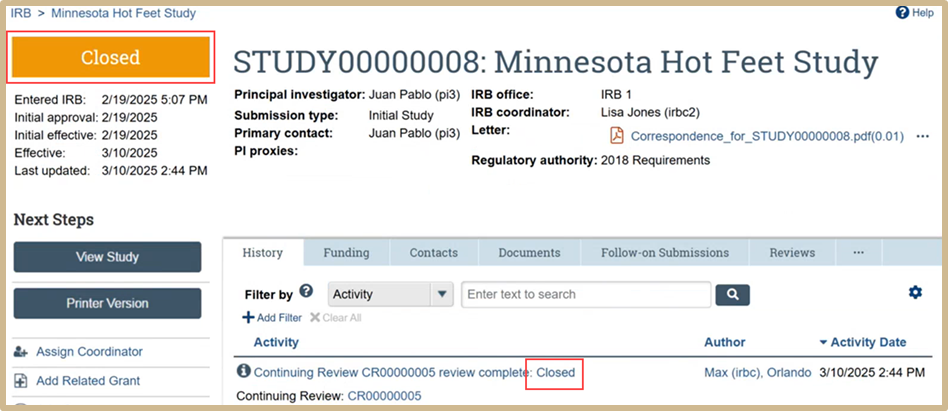 NOTE: If there is Psite, the Psite will need to be closed first before you can send the study closure letter.
